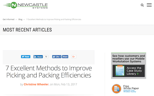 Newcastle Systems provides innovative mobile workstations and wheeled carts to optimize space and productivity to businesses. Christine Wheeler's Newcastle Systems article begins by highlighting the reason that warehouses need to improve picking practices, based on research by professor René de Koster: "measured in time and money - order picking is without doubt the most costly activity in a typical warehouse. It is also the activity that plays the biggest role for customer satisfaction with the warehouse - and in the final analysis of the entire supply chain."