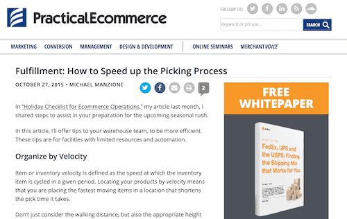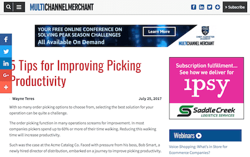 Multichannel Merchant connects the eCommerce community by covering marketing, management, and operations for companies using catalogs, direct, and digital/ecommerce channels. Specifically, they focus on customer service, warehouse operations, and shipping. Wayne Teres' Multichannel Merchant article highlights five ways your organization can increase picking productivity, based on the challenges at Acme Catalog Co.
